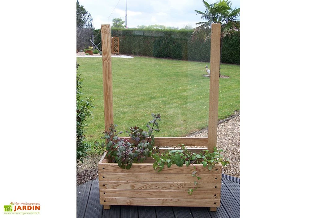 Cette jardinière du fabricant français Jardi-Bois affiche des dimensions de 100 cm de longueur sur 40 cm de largeur pour 150 cm de hauteur. Elle dispose d’un bac à fleurs doté de lames de 2,5 cm d’épaisseur en bois de châtaignier FSC et d’un treillis en plexiglas de 8 mm d’épaisseur. Le bois de châtaignier est naturellement imputrescible, mais il dispose tout de même de deux couches de lasure pour une résistance accrue face aux agressions extérieures.