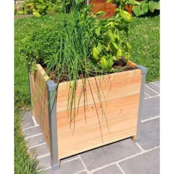 Au design épuré, la jardinière en bois est proposée dans une couleur naturelle, ce qui lui permet de s’intégrer parfaitement dans n’importe quel espace extérieur. Ses angles en aluminium 100% recyclable ainsi que les capuchons en PVC recyclé lui donnent un style contemporain. Le bac à fleurs carré en bois est équipé d’un feutre de protection découpé aux bonnes dimensions afin de bénéficier d’un meilleur drainage de la terre.