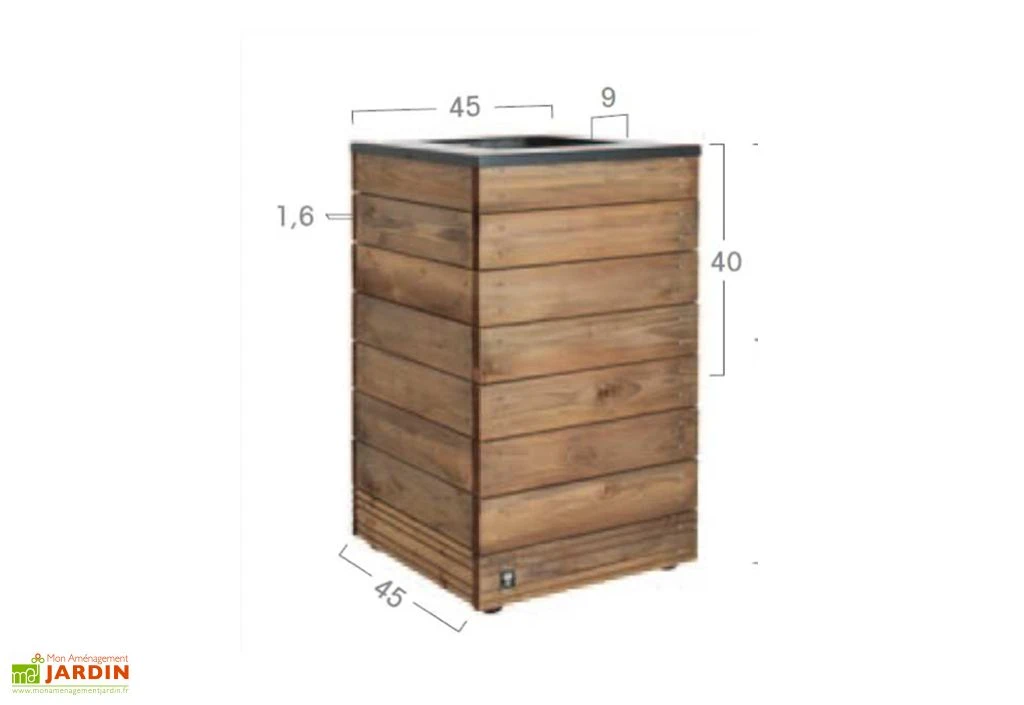 Ce bac Ă fleurs Selekt de chez Jardipolys possède une contenance de 63 L. Il a Ă©tĂ© fabriquĂ© en France Ă partir de bois de sapin et Ă©picĂ©a traitĂ© autoclave de classe 3 pour lui permettre de rester dehors toute l’annĂ©e sans pourrir ni se dĂ©grader. Son bois est Ă©galement certifiĂ© FSC car il est issu de forĂŞts gĂ©rĂ©es de façon durable et responsable. Ă€ l’intĂ©rieur, ce pot de fleurs mesure 40,8 x 40,8 cm (longueur, largeur) sur 40 cm de hauteur. Ses dimensions extĂ©rieures sont de 45 x 45 cm (longueur, largeur) pour 76 cm de hauteur.Â