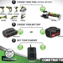 La batterie lithium de Constructor possède une tension de 20V et une intensitĂ© de 2Ah. Elle s’adapte sur tous les outils de la gamme PowerShared ce qui vous permet de facilement passer d’une machine Ă une autre sans avoir Ă changer la batterie. Un chargeur rapide compatible avec cette batterie est disponible dans les accessoires !