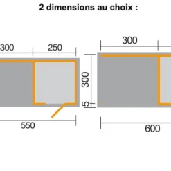 L’abri de jardin existe dans deux dimensions diffĂ©rentes que vous pourrez choisir dans vos options : 550 x 250 x 244 cm (l,l,h) ou 600 x 300 x 244 cm (l,l,h). Le bungalow est disponible dans deux coloris : brut naturel et non traitĂ© ou anthracite sur l’extĂ©rieur avec une lasure de protection Ă l’intĂ©rieur (plancher, plafond, parois) en coloris chĂŞne clair. Avec ce traitement, l’abri est protĂ©gĂ© contre les intempĂ©ries, la prolifĂ©ration des moisissures et le bleuissement.Â