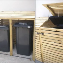 Le cache-poubelle double de chez Gardival est en pin traitĂ© autoclave. Il ne demande pas d’entretien et rĂ©siste parfaitement Ă la moisissure et aux insectes. Le cache-poubelle permet de stocker 2 poubelles. Il mesure 88 cm de profondeur, 145 cm de largeur et 137 cm de hauteur. Le cache-poubelle est constituĂ© de planches en bois de 16 mm d’épaisseur et de 58 mm de hauteur. Il dispose d’un couvercle avec compas d’arrĂŞt et d’un fond afin de cacher parfaitement vos poubelles.Â