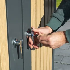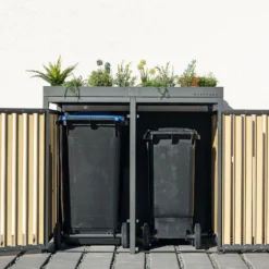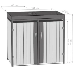 Cet abri poubelle extérieur Westmann mesure 134 cm de longueur, 84 cm de profondeur et 125 cm de hauteur (dimensions intérieures : 133 x 80 x 114 cm) et comprend 2 portes battantes individuelles qui permettront de dissimuler chacune une poubelle de 240 litres. Les poignées sont verrouillables, vous permettant de transformer l’abri en coffre de rangement par exemple. Le seuil bas permet d’entrer et de sortir facilement les 2 poubelles.