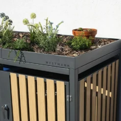 Ce cache poubelle double comprend une structure en acier recouvert d’une peinture par poudrage gris anthracite et des parois de 0,8 mm en acier recouvert d’une peinture par poudrage imitation bois. Son design esthétique est facile à intégrer dans le jardin et le poudrage permet de protéger efficacement le métal contre la corrosion et les rayures.
