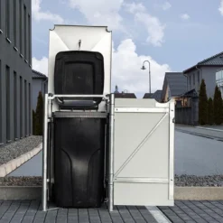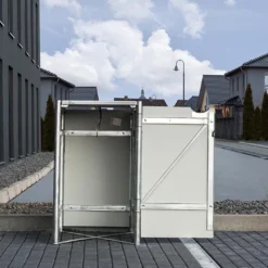 Cet abri pour poubelle mesure 69,7 x 80,7 cm pour 115,2 cm de haut. Il est dotĂ© d’une solide armature en acier galvanisĂ© et de parois faites de panneaux composites en aluminium. Outre leur grande rĂ©sistance face Ă l’humiditĂ© et Ă la corrosion, ces matĂ©riaux possèdent Ă©galement l’avantage d’être ininflammables et de ne demander aucun entretien.Â