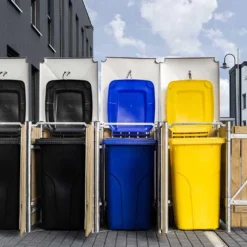 ProposĂ© dans une finition bois naturel ou gris clair, ce cache-poubelles de la marque Hide pourra accueillir jusqu’à quatre conteneurs de 140 L. Il mesure 241,6 x 63,4 cm, pour 115,2 cm de haut, et dispose de portes frontales et de couvercles permettant de remplir et de sortir chaque poubelle individuellement et en toute simplicitĂ©. LivrĂ© en kit, il devra ĂŞtre assemblĂ© et installĂ© par vos soins.Â
