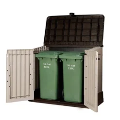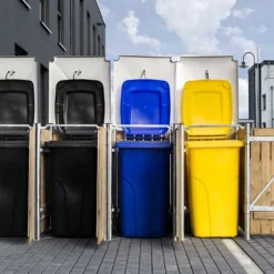 Ce cache-poubelle quadruple de chez Hide permet de placer vos conteneurs Ă l’abri des intempĂ©ries et des animaux tout en les rangeant hors de vue Ă des fins esthĂ©tiques. Il est mĂŞme disponible dans deux finitions diffĂ©rentes, Ă savoir bois naturel ou gris clair, afin que vous puissiez opter pour la version qui correspondra le mieux Ă votre extĂ©rieur. Ses dimensions de 278,8 x 80,7 cm, pour 115,2 cm de haut, lui permettent de loger quatre bennes de 240 L (portes et couvercles individuels).Â