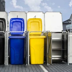 PensĂ© pour protĂ©ger vos poubelles des intempĂ©ries tout en les plaçant hors de vue, ce cache-poubelle en mĂ©tal mesure 278,8 x 80,7 cm, pour une hauteur de 115,2 cm. Ces dimensions lui permettent d’accueillir quatre conteneurs de 240 L chacun. Ses portes frontales et ses couvercles se chargeront pour leur part de faciliter le remplissage et la sortie de vos poubelles. Notez enfin que ce cache poubelles est livrĂ© en kit, Ă monter soi-mĂŞme.Â