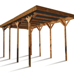 Ce carport en bois signé Maderland est fabriqué en Espagne. Le bois lamellé collé qualité GL24 utilisé pour sa conception est encore plus solide que le bois massif. Il est issu d’Europe du Nord et bénéficie donc d’une bonne résistance aux conditions extérieures mais un traitement fongicide et insecticide permettra d’apporter une protection supplémentaire.