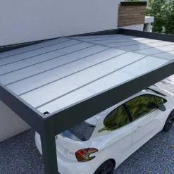 Le carport mural Libeccio de chez Trigano est doté d’une solide structure en aluminium gris anthracite, une finition élégante qui facilitera son intégration dans votre extérieur. Robuste et insensible à la corrosion, l’aluminium est un matériau qui ne demande ni traitement, ni entretien particulier. Il s’agit également d’un métal plutôt léger, ce qui facilitera la manipulation des différentes pièces qui composent le carport au moment de son montage. Cet abri pour voiture est en effet livré en kit et devra être monté par vos soins (visserie inox et ancrage inclus).