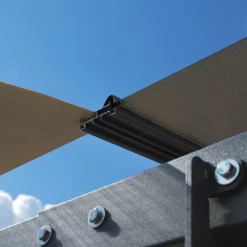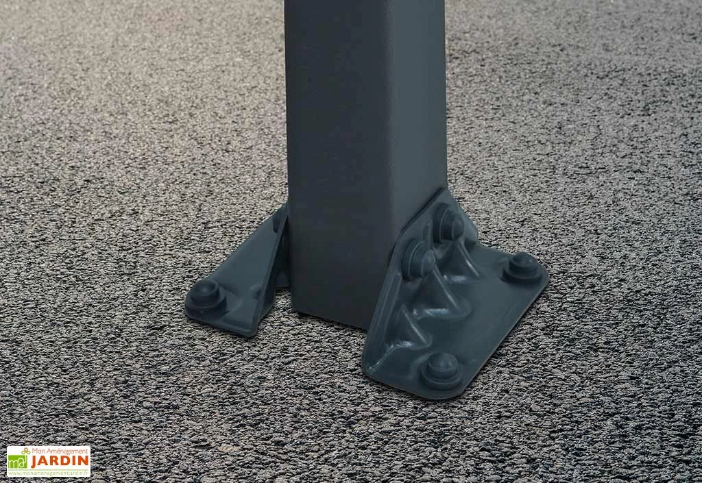 Ce grand carport est dotĂ© d’une solide structure en aluminium (de 2mm d’Ă©paisseur sur les poteaux) gris anthracite RAL 7016 avec connexions en acier galvanisĂ©. Cette structure supporte une couverture faite de panneaux en polycarbonate semi-transparent de 6 mm d’épaisseur, conçus pour filtrer 100% des rayons UV. Ils ne jauniront donc pas et protègeront efficacement vos vĂ©hicules.Â