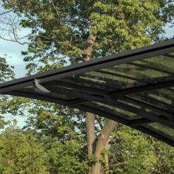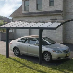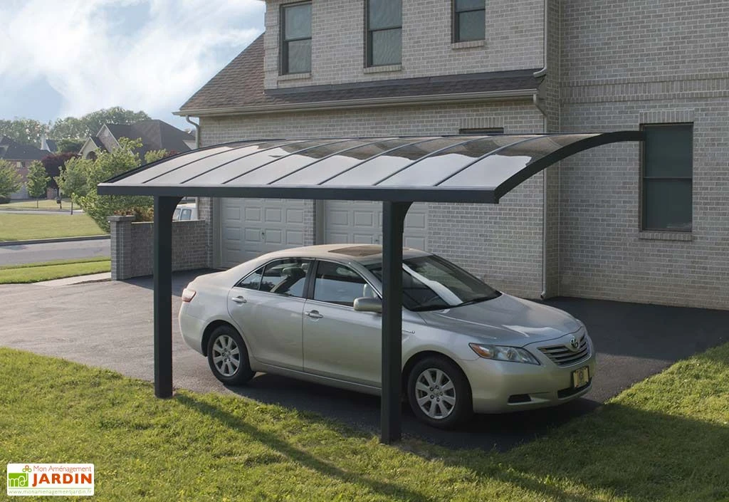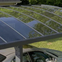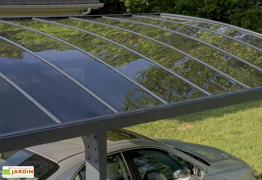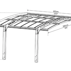 Le carport Arizona de chez Palram-Canopia séduit par sa forme originale. Ce carport autoportant ne dispose que de 2 poteaux de 16 x 8 cm, qui assurent parfaitement sa stabilité. Il mesure 4,95 cm de longueur, 3,00 m de largeur et 2,73 m de hauteur faitage pour une hauteur de passage de 2,55 m. Sa forme est épurée et son design s’intègre dans tous les jardins.