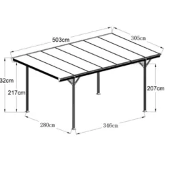 Ce carport en aluminium fabriqué par Forest-Style bénéficie d’une surface totale de 15,34 m² grâce à des dimensions hors tout de 5,03 x 3,05 m. Il possède une hauteur de passage de 2,07 m et culmine à 2,32 m. Les dimensions entre ses poteaux sont de 2,80 m à l’avant et 3,46 m sur les côtés.
