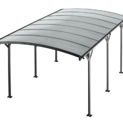 Ce carport en aluminium est revêtu d’une peinture gris anthracite pour une intégration aisée dans tous les jardins. Ses 6 poteaux de 10 x 4 cm de section lui offrent une excellent stabilité. Les poteaux pourront être fixés sur des plots en béton grâce au kit d’ancrage fourni. (Béton non fourni.)