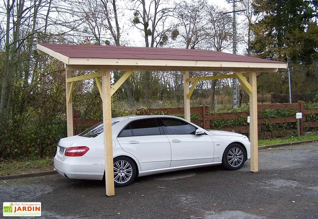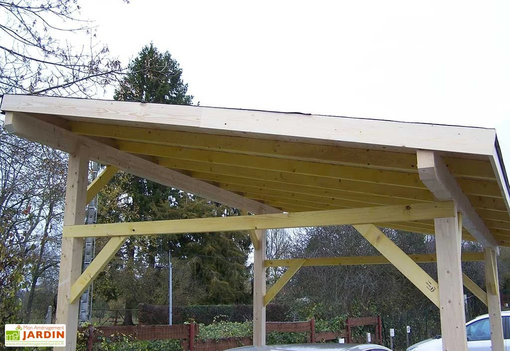 L’abri pour voiture en bois est constitué de 4 poteaux en épicéa du Nord, de 2 pannes et de 2 sablières transversales en bois de charpente et de chevrons en sapin massif. Tous ces éléments ont reçu un traitement fongicide et insecticide CTBP+ qui protège le bois contre la moisissure et les insectes xylophages. Le bois est certifié PEFC.