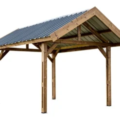 Le carport en bois dispose d’une structure en chevrons de 4 x 12 et 4 x 14 cm de section. La toiture double pente dispose d’une couverture en bac acier galvanisé avec cavaliers et vis en acier zingué. Résistante, elle permet de protéger efficacement votre voiture contre les agressions extérieures.