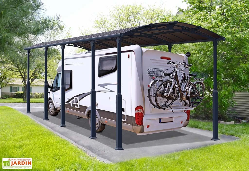 LivrĂ© en kit, ce grand carport devra ĂŞtre montĂ© et installĂ© par vos soins. Sa solide structure en aluminium gris anthracite RAL 7016 dispose de raccords en acier galvanisĂ© et accueille une couverture composĂ©e de panneaux en polycarbonate semi-transparent de 6 mm d’épaisseur. Ces panneaux sont conçus pour filtrer 100% des rayons UV, le tout sans jamais jaunir ou dĂ©colorer.Â