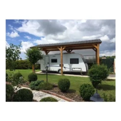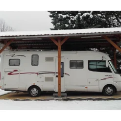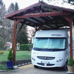 Ce carport pour camping-car est fabriqué en bois Douglas de classe 3, un bois naturellement imputrescible et insensible aux insectes, qui ne vous demandera que peu d’entretien. Vous pourrez appliquer une lasure pour éviter que sa teinte ne grise sous l’action des UV ou une peinture pour le personnaliser mais il ne vous demandera pas de traitement fongicide ou insecticide.