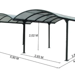 Le double carport Habrita permet de protéger deux véhicules ou plusieurs motos. Il mesure 4,85 m de longueur, 5,90 m de largeur et 2,50 m de hauteur au total. La hauteur de passage est de 2,02 m. Le carport dispose de 6 poteaux de 7 x 7 cm avec platines en acier de fixation au sol de 17 x 17 cm. Les chevilles à expansion pour béton sont incluses.