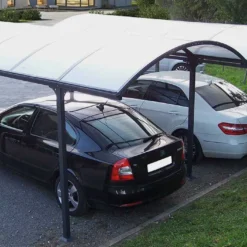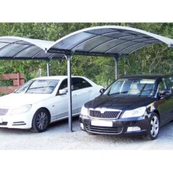 Le carport double et sa toiture arrondie possèdent un design contemporain qui s’intègre parfaitement dans tout type de jardin. La toiture est Ă©quipĂ©e de gouttières latĂ©rales qui permettent d’évacuer l’eau. Une bâche pour carport double est disponible dans les accessoires pour protĂ©ger la toiture.Â