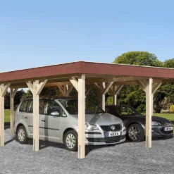Ce grand carport Weka mesure 6,22 m de large sur 6,39 m de profondeur, soit suffisamment d’espace pour accueillir simultanément deux véhicules (surface couverte : 39,75 m²). Il offre en effet deux espaces de stationnement bien distincts, chacun profitant d’une largeur et d’une hauteur de passage de respectivement 2,70 et 2,09 m. Vous pourrez donc garer vos voitures à l’abri des intempéries, du soleil et d’éventuelles chutes de branches, entre autres.