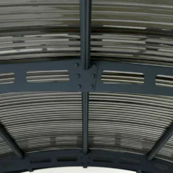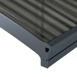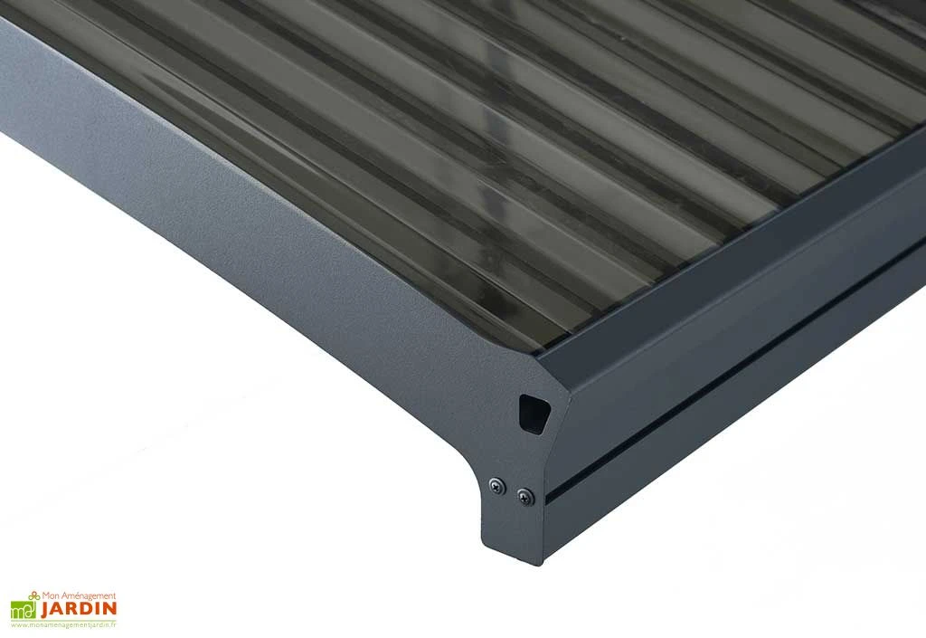 La toiture de cet abri pour voiture est constituĂ©e de panneaux de polycarbonate ondulĂ©s ultra-rĂ©sistants de 0,7 mm d’épaisseur. Ces panneaux teintĂ©s bronze laissent passer 10% de la lumière naturelle tout en filtrant les rayons UV. Très solide, notamment en cas de grĂŞle, cette couverture pourra supporter une charge de 100 kg/m², en cas de chutes de neige par exemple. A noter Ă©galement, la prĂ©sence d’un système de gouttières permettant un Ă©coulement efficace des eaux pluviales.