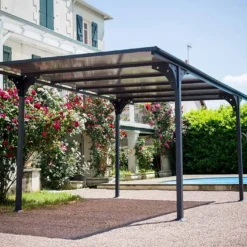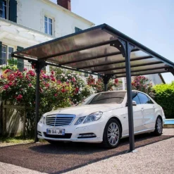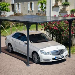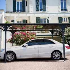 Le carport comprend une structure en aluminium gris anthracite, d’une Ă©paisseur de 1,4 mm. Ses 4 poteaux en aluminium possèdent une section de 7 x 7 cm. Il est livrĂ© avec des pièces de raccordement et des platines de fixation en acier.Â