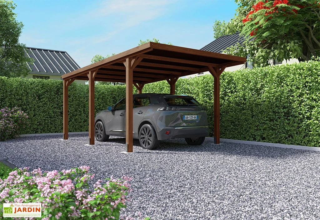 Ce carport Victor de chez Forest-Style est fabriqué à partir de bois de pin certifié FSC, ce qui signifie que le bois provient de forêts gérées dans le respect de l’environnement. De plus, le bois est doté d’un traitement autoclave marron classe 3 lui offrant une protection contre les différentes agressions extérieures telles que les champignons, l’humidité et les insectes. Aucune lasure et peinture n’est nécessaire.