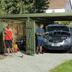 Votre carport PLUS de chez Weka est fabriquĂ© en pin (FSC) imprĂ©gnĂ© en autoclave (IAC) qui lui garantira une bonne tenue dans le temps. Le carport est constituĂ© d’un petit ou d’un grand local Ă outils a sĂ©lectionner en option. La section des poteaux est de 90×90 mm. Le toit du carport est en plastique de forme trapĂ©zoĂŻdale. Il est fixĂ© au moyen de vis de plombier avec rondelles de joint moulĂ©es et cales d’espacement qui Ă©vitent l’Ă©crasement de la plaque sur la poutre. Le carport a une largeur de passage de 2,70 m de chaque cotĂ© et une hauteur de passage de 2,15 m. Le carport rĂ©siste a 125 Kg/m² de neige. Le carport Weka est livrĂ© en kit, Ă monter facilement soi-mĂŞme avec une notice de montage dĂ©taillĂ©e sans accessoires (ancrage en H) ni dĂ©coration. Weka garantit votre carport 5 ans sur toutes les pièces en bois et 2 ans pour le reste. Le visuel prĂ©sentĂ© correspond au grand local Ă outil.
