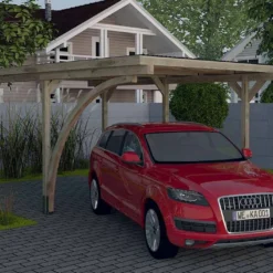 Ce carport pour voiture de la marque Weka permet de stationner un véhicule à l’abri des intempéries, des chutes de branches et des déjections d’oiseau. Il dispose d’une solide structure en bois qui mobilise un arc qui, au-delà de ses qualités esthétiques, facilitera vos manœuvres au moment de vous garer.