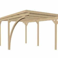 Entièrement fabriquée en bois de pin traité par autoclave, la structure de ce carport simple comprend cinq poteaux de 9 cm de section, ces derniers étant complétés par l’arche évoquée plus haut. Ainsi traité, le bois utilisé pour sa conception est parfaitement protégé contre les insectes, les champignons et l’humidité qui pourraient le dégrader.