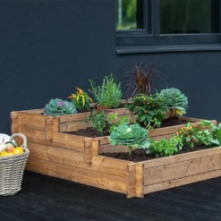 Il est composé de 3 niveaux : le premier étage mesure 19 cm de hauteur, le deuxième mesure 28,9 cm et le dernier mesure 40 cm. Ce carré potager possède des planches de 95 mm et 44 mm de largeur et 18 mm d’épaisseur. Il est livré avec son géotextile.