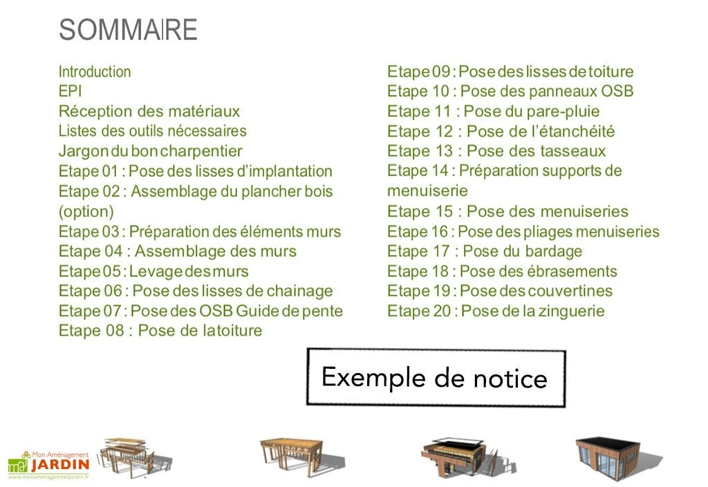 L’abri est livré en kit avec une notice de montage. L’assemblage y est détaillé étape par étape avec des illustrations et même une vidéo pour la pose des menuiseries. Si vous ne choisissez pas le plancher associé, il est impératif d’installer cet abri sur une dalle de béton, dont nous vous fournissons les plans. Cette solution de livraison en kit est préconisée pour les artisans, les professionnels ou les excellents bricoleurs.