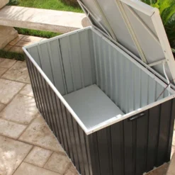 Ce coffre de jardin gris anthracite peut rester Ă l’extĂ©rieur toute l’annĂ©e puisqu’il possède une excellente rĂ©sistance face Ă la corrosion. Il comprend deux poignĂ©es et un plancher, qui vous permettront de le dĂ©placer si besoin. Un kit d’ancrage est inclus pour le fixer au sol afin de le protĂ©ger contre les rafales de vent.