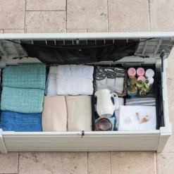 Le coffre de rangement extérieur est en polypropylène, un matériau qui ne demande aucun entretien. Ce dernier résiste aussi bien à la moisissure, qu’aux attaques d’insectes et aux variations importantes de température. Il a également reçu un traitement anti-UV qui permet de le protéger des rayons du soleil et par conséquent de la décoloration, du jaunissement et de la fragilisation.