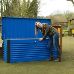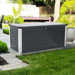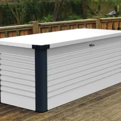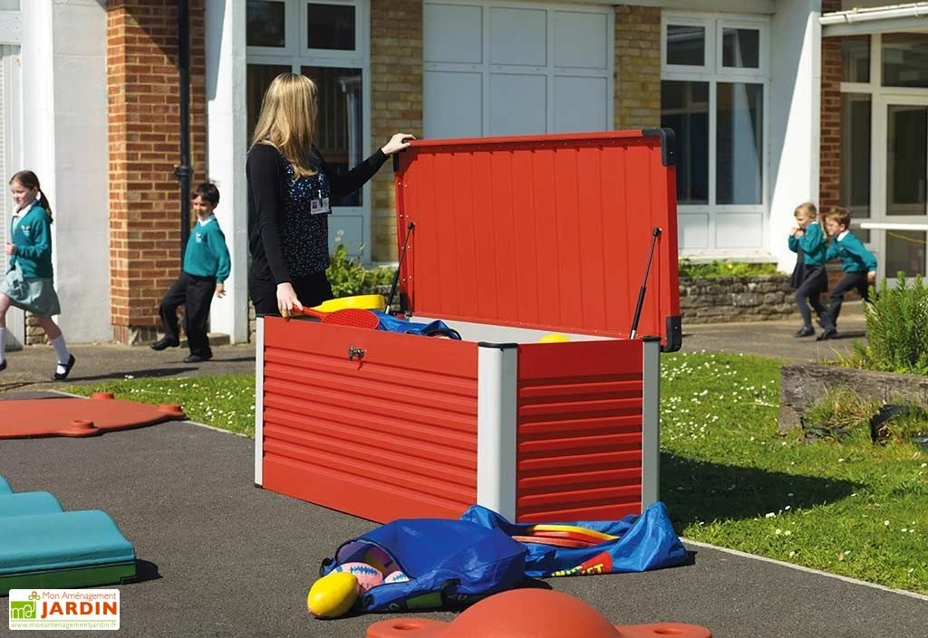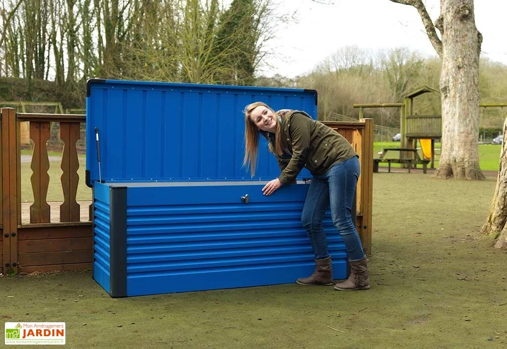 Le coffre de rangement est en acier galvanisĂ© et gainĂ© PVC. Il est rĂ©sistant Ă la corrosion sans demander aucun entretien. Il peut rester dehors toute l’annĂ©e puisqu’il ne craint pas la moisissure ni les attaques d’insectes. Il est Ă©galement rĂ©sistant au feu.