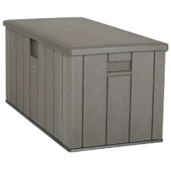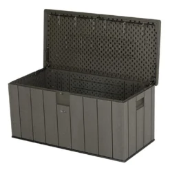 Le coffre est en polyĂ©thylène haute densitĂ©, un matĂ©riau rĂ©sine parfaitement rĂ©sistant aux agressions extĂ©rieures. Il ne craint pas la moisissure, il est insensible Ă la corrosion et aux attaques d’insectes. Pour une intĂ©gration parfaitement dans le jardin, le PVC imite parfaitement le bois. Vous profitez ainsi d’un coffre avec les avantages esthĂ©tiques du bois sans les inconvĂ©nients de l’entretien.Â