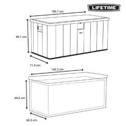 Le coffre de rangement Lifetime possède une contenance de 567,8 litres grâce Ă ses dimensions de 71,9 cm de profondeur, 150,7 cm de largeur et 69,1 cm de hauteur. Il s’installe dans le jardin, dans le garage ou dans la maison pour vous permettre de protĂ©ger vos Ă©quipements de piscines, coussins de mobiliers ou encore les jouets des enfants.Â