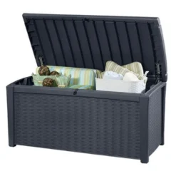 L’intérêt de ce coffre de jardin est sa grande praticité, qui s’illustre par la présence d’une double ouverture sur le devant et le dessus du meuble (cf photo). Il est donc plus simple d’accéder à vos petits objets par le dessus du rangement extérieur, et de disposer des plus volumineux par la porte avant. Le coffre possède un loquet, sur lequel vous pourrez ajouter un cadenas et garder ainsi vos objets en sécurité.