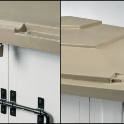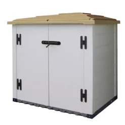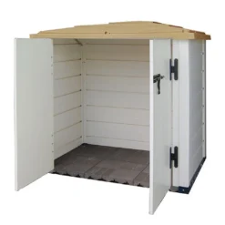 Le coffre de rangement est Ă©quipĂ© d’un plancher constituĂ© de dalles en bois composite d’une Ă©paisseur de 4,5 cm et d’un toit en ABS anti-UV basculant grâce Ă des vĂ©rins. Il dispose Ă©galement de portes battantes en PVC qui ferment grâce Ă un verrou en mĂ©tal.Â