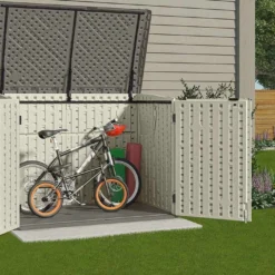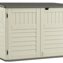 Le coffre de rangement Suncast Stowaway est en polyéthylène haute densité, un matériau résistant et qui ne demande aucun entretien. Le coffre mesure 1,12 m de profondeur, 1,79 m de largeur et 1,32 m de hauteur. Il est parfait pour le rangement de vélos d’enfants, pour cacher vos poubelles de ville ou pour stocker vos équipements de jardin. L’ouverture se fait par le haut et par la façade. Les dimensions intérieures sont de 166 x 98 x 125 cm (l,l,h). L’ouverture du couvercle est facilitée par 2 vérins à gaz.
