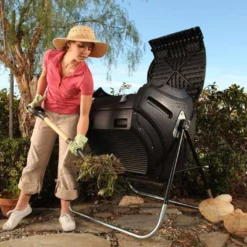 Le composteur rotatif de chez Lifetime de 303 L est en polyéthylène haute densité avec double parois. Sa matière lui confère une grande longévité et permet de retenir la chaleur. Ses dimensions de 1,09 x 0,90 x 1,01 m (l,l,h) offrent un confort optimal et vous évite de vous baisser.