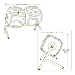Votre composteur rotatif de chez Lifetime est composé de 2 tambours de 189 L chacun. Il mesure 1,43 x 0,79 x 1,10 m (l,l,h) et est composé de polyéthylène haute densité double paroi, permettant de conserver la chaleur et de résister dans le temps. Sa structure est en acier galvanisé et des barres de ventilation à l’intérieur des bacs permettent une bonne ventilation favorisant un meilleur compost. Les tambours tournent sur leur axe et se bloquent grâce à une broche.