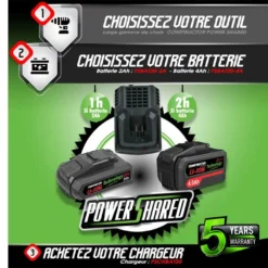 Le taille bordures électrique fonctionne avec une batterie 2Ah ou une batterie 4Ah de 20 volts ainsi que le chargeur rapide de la gamme PowerShared qui sont vendus séparément et sont compatibles avec l’ensemble des outils de la gamme PowerShared.