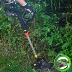 Le coupe bordures à batterie possède un fil avec avance automatique et un diamètre de coupe de 25 cm. Rassurez-vous, un étrier de protection pour les plantes est inclus !