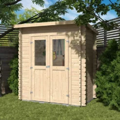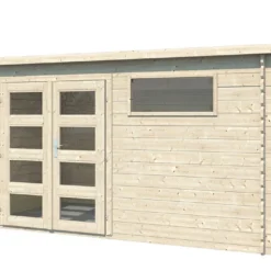 Entièrement conçu en bois d’épicéa, ce garage de jardin possède des parois de 44 mm d’épaisseur composées de madriers biseautés à double rainures. Le bois utilisé étant brut, il vous faudra le protéger de l’humidité, de la moisissure et des insectes xylophages à l’aide d’un traitement insecticide/fongicide et en lasurant toutes les pièces. Ce bois est par ailleurs certifié FSC, ce qui signifie qu’il est issu de forêts gérées dans le respect de l’environnement.