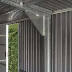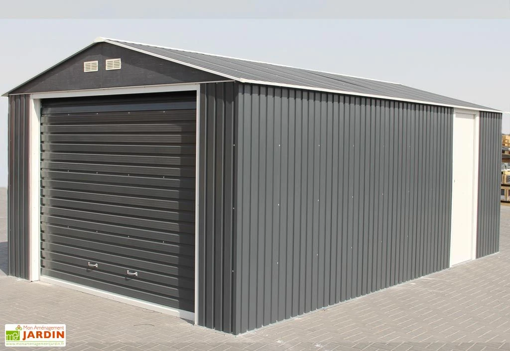 Le garage est constituĂ© de panneaux de mĂ©tal de 0,33 mm d’Ă©paisseur, recouverts de 3 couches de peinture Ă chaud. Cet abri ne nĂ©cessite aucun entretien et rĂ©siste aussi bien Ă la corrosion qu’aux vents violents. Pour assurer encore sa soliditĂ©, le garage est constituĂ© de poutres de toit. Cet abri en mĂ©tal est Ă©quipĂ© d’une large porte de 1,90 m de hauteur et de 2,51 m de largeur qui se ferme Ă clĂ© par l’intĂ©rieur. Une seconde porte sur le cĂ´tĂ© d’une largeur de 63 cm et d’une hauteur de 2 mètres vous permet de sortir et de fermer le garage Ă clĂ©, par l’extĂ©rieur. La porte de service peut ĂŞtre installĂ©e Ă droite ou Ă gauche du garage.