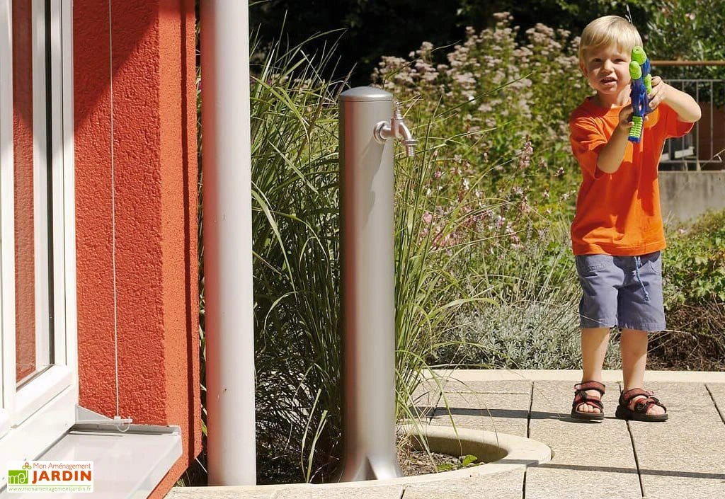 La fontaine extérieure permet de disposer d’un point d’eau à n’importe quel endroit du jardin. Elle se raccorde au réseau d’eau potable mais vous pouvez également la raccorder à un réseau interne si vous disposez d’un système de récupération des eaux de pluie.