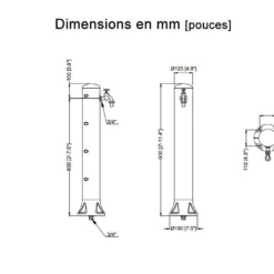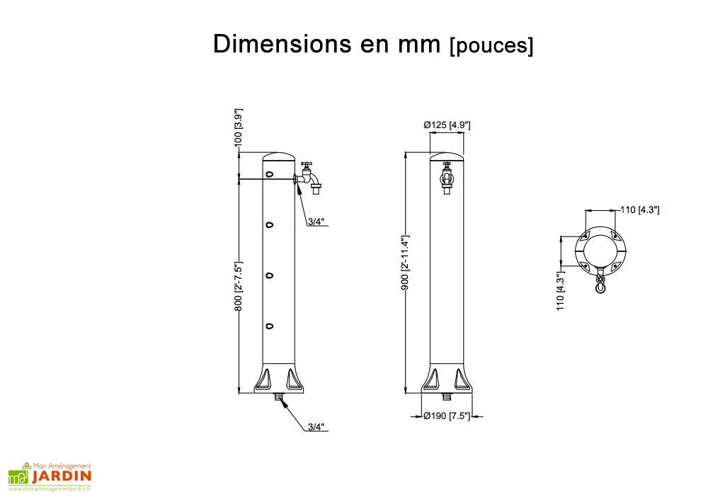 La fontaine de jardin dispose d’un socle de fixation avec 4 point d’ancrage. Elle doit être scellée impérativement sur une dalle en béton (vis d’ancrage non incluses). Elle bénéficie d’un raccordement 3/4″(19 mm) par le bas et elle est livrée avec son robinet en laiton 3/4″(19 mm). Le robinet est déjà monté sur la fontaine.
