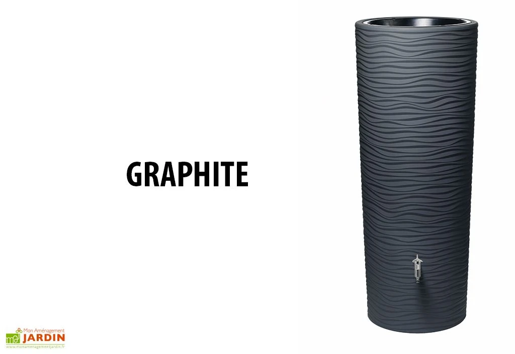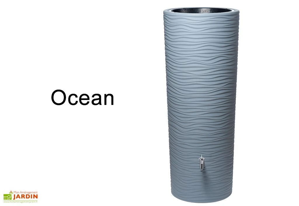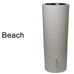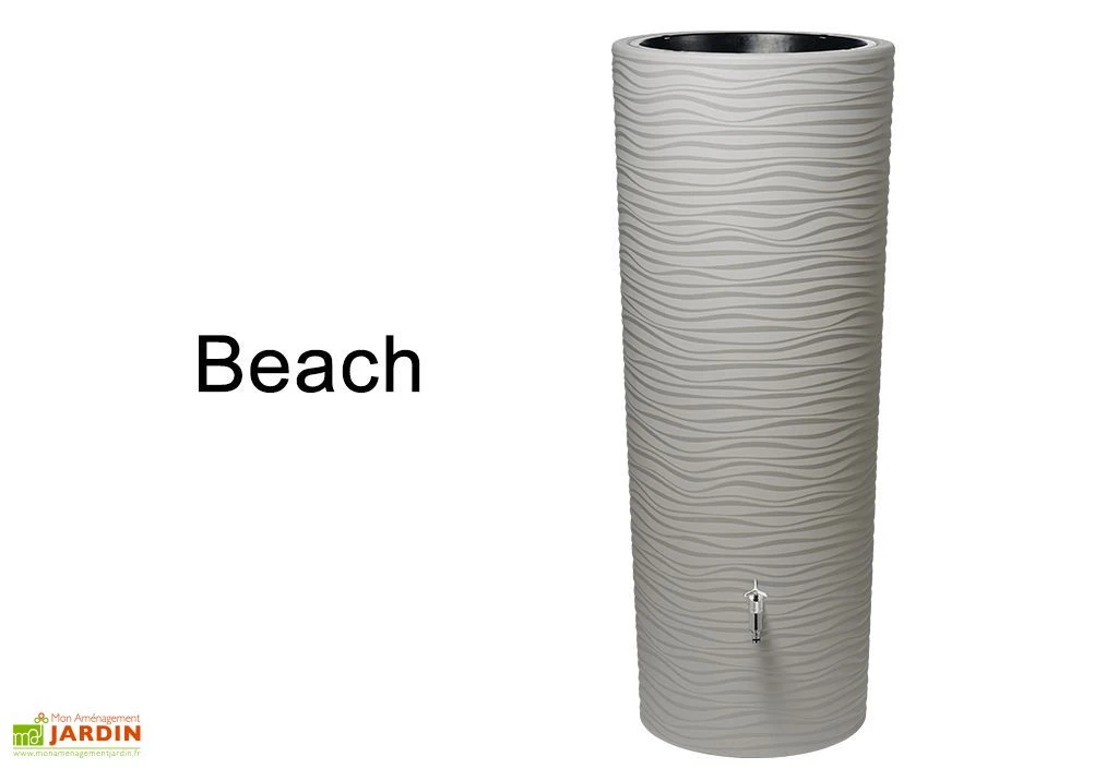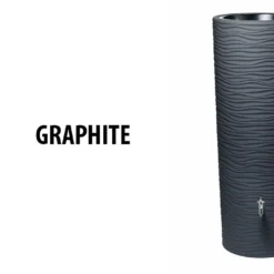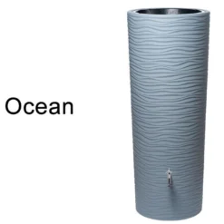 Le récupérateur d’eau de pluie mesure 50 cm de diamètre à la base, 62 cm de diamètre en haut et 150 cm de hauteur. Il possède une contenance de 350 litres. Ses coloris naturels s’intègrent parfaitement dans tous types de jardin. Originale, sa surface ondulée permet à la teinte de changer suivant la luminosité pour apporter des contrastes esthétiques.